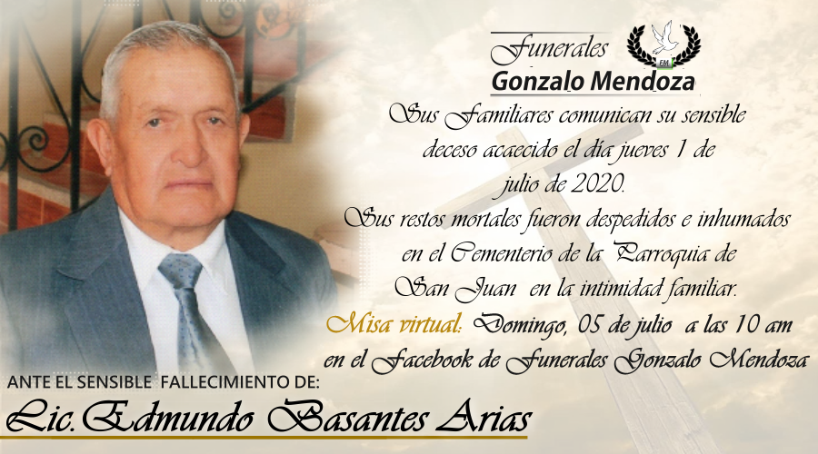 La misa virtual será transmitida por la página de Facebook Live de la Funeraria Gonzalo Mendoza Cía. Ltda. Del fin de semana el día domingo 5 de julio de 2020, a las 10:00 am.