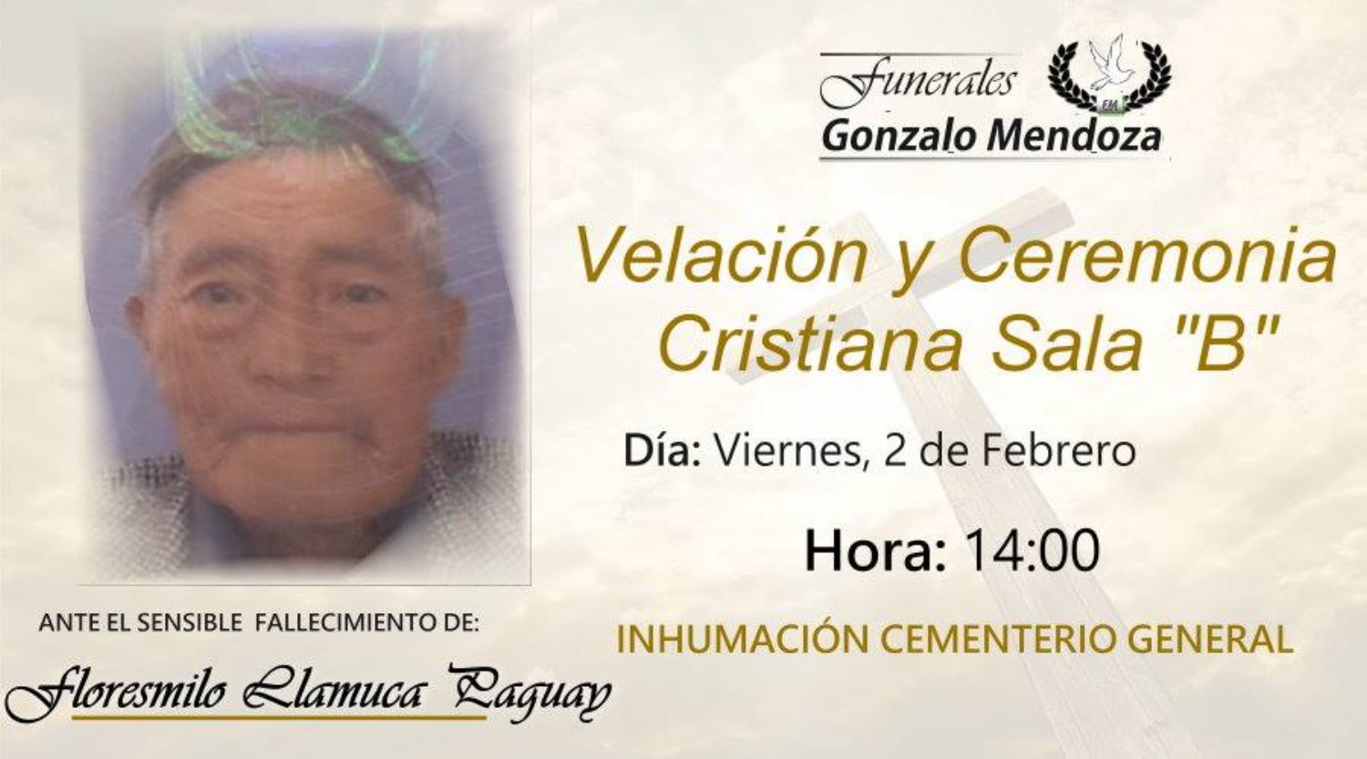 Bisnietos. Hermanos políticos, sobrinos, primos y más familiares tienen el pesar de comunicar su sensible fallecimiento acaecido el miércoles 31 del presente e invitan a la velación de sus restos mortales en la sala “B” de Funerales Gonzalo Mendoza; donde se oficiará su ceremonia cristiana el día viernes 2 de febrero a la 1 de la tarde y luego al Cementerio General para su cristiana sepultura.