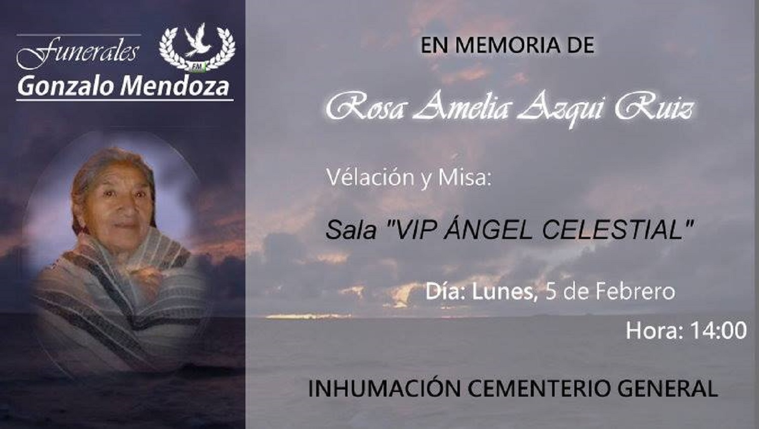 Primos y demás familiares tienen el pesar de comunicar su sensible fallecimiento acaecido el día sábado 3 del presente e invitan a la velación de sus restos mortales en la Sala VIP Memorial de los Ángeles el día lunes 5 de febrero a las 2 de la tarde y de ahí al Cementerio General para su inhumación.