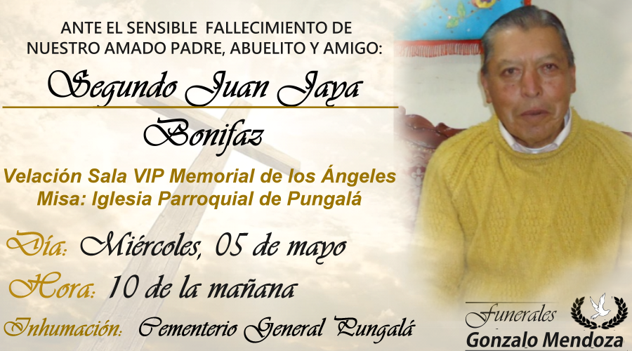 E Invitan a la velación de sus restos mortales en la sala Vip Memorial de los Ángeles de Funerales Gonzalo Mendoza y su posterior traslado a su tierra natal Pungalá, el día miércoles 05 de mayo a las 10h00.