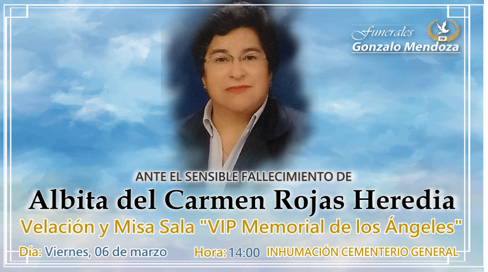 Sobrinos, primos y demás familiares tienen el pesar de comunicar su sensible fallecimiento acaecido el día miércoles 4 de marzo 2020, e invitan a la velación de sus restos mortales desde la Sala “VIP Memorial de los Ángeles” de Funerales Gonzalo Mendoza donde se oficiará su misa de cuerpo presente el día viernes 6 de marzo a las 14:00 y de allí al Cementerio General para su cristiana sepultura.