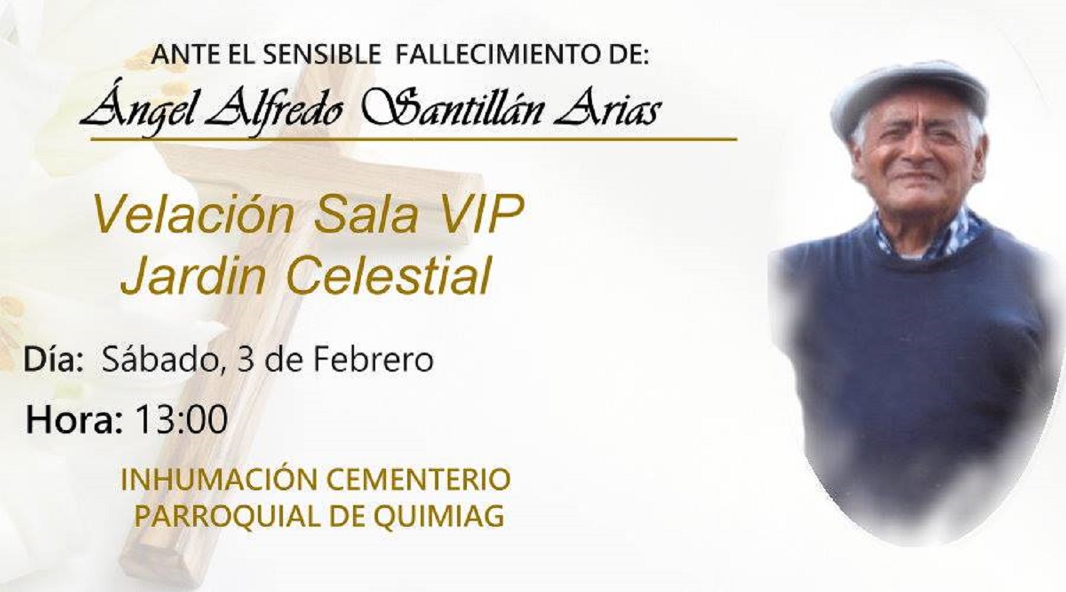 Sobrinos, primos y demás familiares tienen el pesar de comunicar su sensible fallecimiento acaecido el día jueves 1 de febrero e invitan a la velación de sus restos mortales en la Sala VIP Jardín Celestial el día sábado 3 de febrero a las 1 de la tarde y de ahí al Cementerio Parroquial de Quimiag para su inhumación