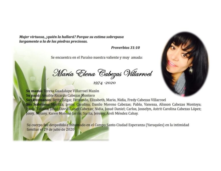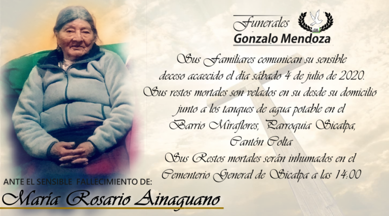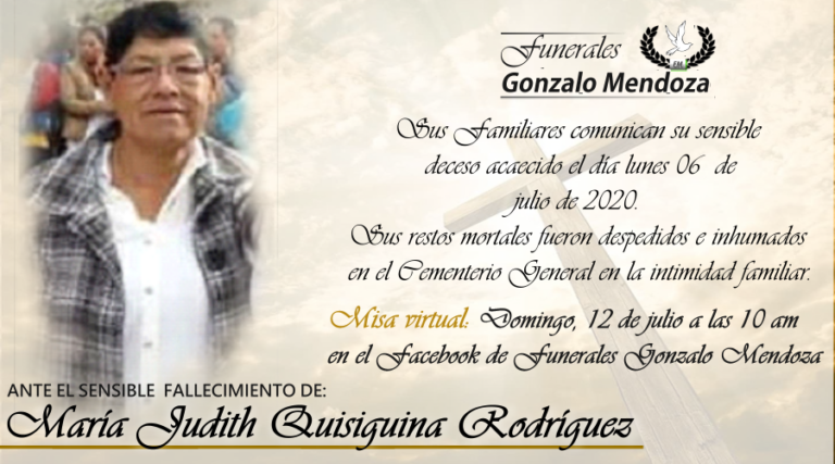 Riobamba, 06 de julio Parte Mortuorio Entregó su alma al Creador quien en vida fue: María Judith Quisiguina Rodríguez Su Esposo : Alfonzo Veliz(+) Sus Hijos: Telmo Fernando Quisiguiña, Rosa Molina, Julieta Veliz. Sus Nietos: Telmo Stalin Quisiguiña, Paulina Quisiguiña,…