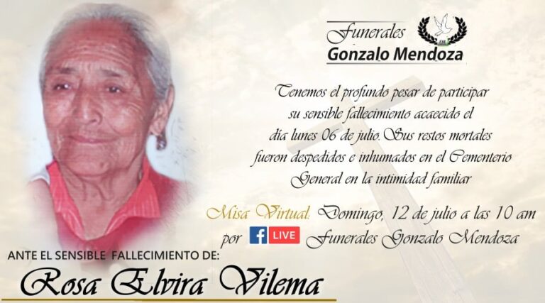 Parte Mortuorio Entregó su alma al Creador quien en vida fue: Rosa Elvira Vilema Sus Hijos: Walter, Fausto, Olga, Patricia, Oswaldo, Mónica, Luis Sus Hijos políticos: Elena Arévalo, Julio Pimentel, Manolo Granizo , Eduardo González, Jenny Valdiviezo Sus Nietos: Sonia…