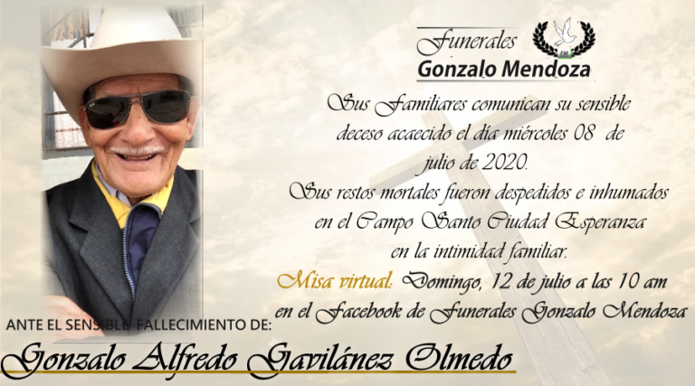 Parte Mortuorio Entregó su alma al Creador quien en vida fue: Sr. Gonzalo Alfredo Gavilánez Olmedo + Sus Padres: FRANCISCO GAVILANEZ + Y ANTONIA OLMEDO + Su Esposa: Sra. TERESA DE JESÚS YÉPEZ FIGUEROA + Sus Hijos: JANETH, HECTOR, GINA,…
