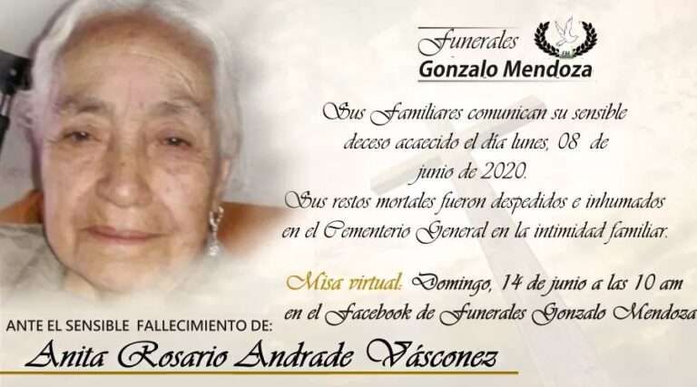 “Silencio caminante Baja el tono de tu voz Que nuestra madre no está muerta Simplemente se ha dormido En los brazos del Señor”. PARTE MORTUORIO Entregó su alma al Creador quien en vida fue la Señora. Anita Rosario Andrade Vásconez…