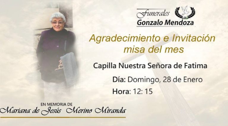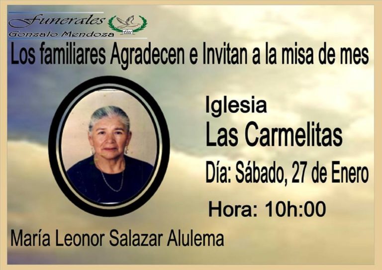 [su_animate type=»slideInUp»] Riobamba, 27 de EneroGracias Dios mío:“Por habernos dado un Esposa, Madre y Abuelita tan amadaSiempre le veremos, tendiéndonos su cálido abrazo y su sonrisa cariñosaPor haber sido un mujer pertinaz aferrada a su convicciónPor mantener en alto sus…