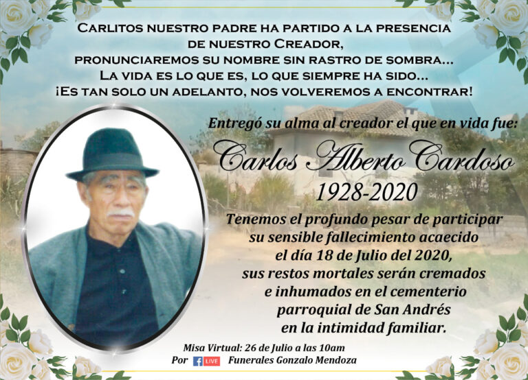 Parte Mortuorio Lloramos tu ausencia Amado Padre y le damos gracias al Señor por habernos permitido compartir junto a tì.Padre tu nos enseñaste a ser fuertes y nobles.Tus huellas marcadas de amor y bondad se quedaran para siempre impregnadas en…