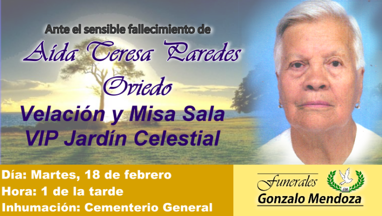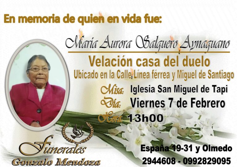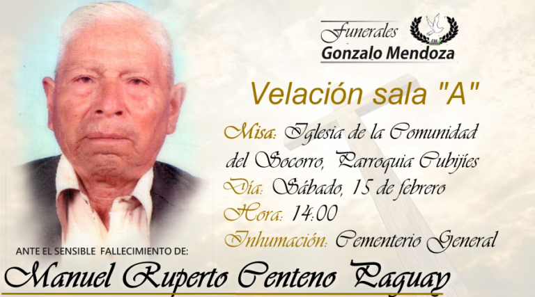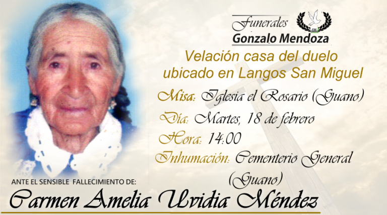 Barrio Langos, San Miguel, 17 de febrero Parte Mortuorio en el Barrio Langos San Miguel A sus 100 años falleció quien en vida se llamó: CARMEN AMELIA UVIDIA MENDEZ. Sus padres: José Uvidia (+) y Cristina Villa (+). Su esposo:…