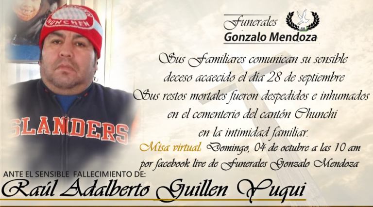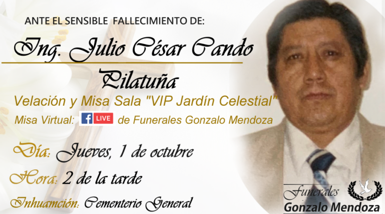 Siempre voy a estar en el corazón de todos ustedes, y desde ese lugar hermoso les cuidaré y les estaré protegiendo siempre. PARTE MORTUORIO Entregó su alma al Creador, quien en vida fue el Señor Ingeniero: Julio César Cando Pilatuña…
