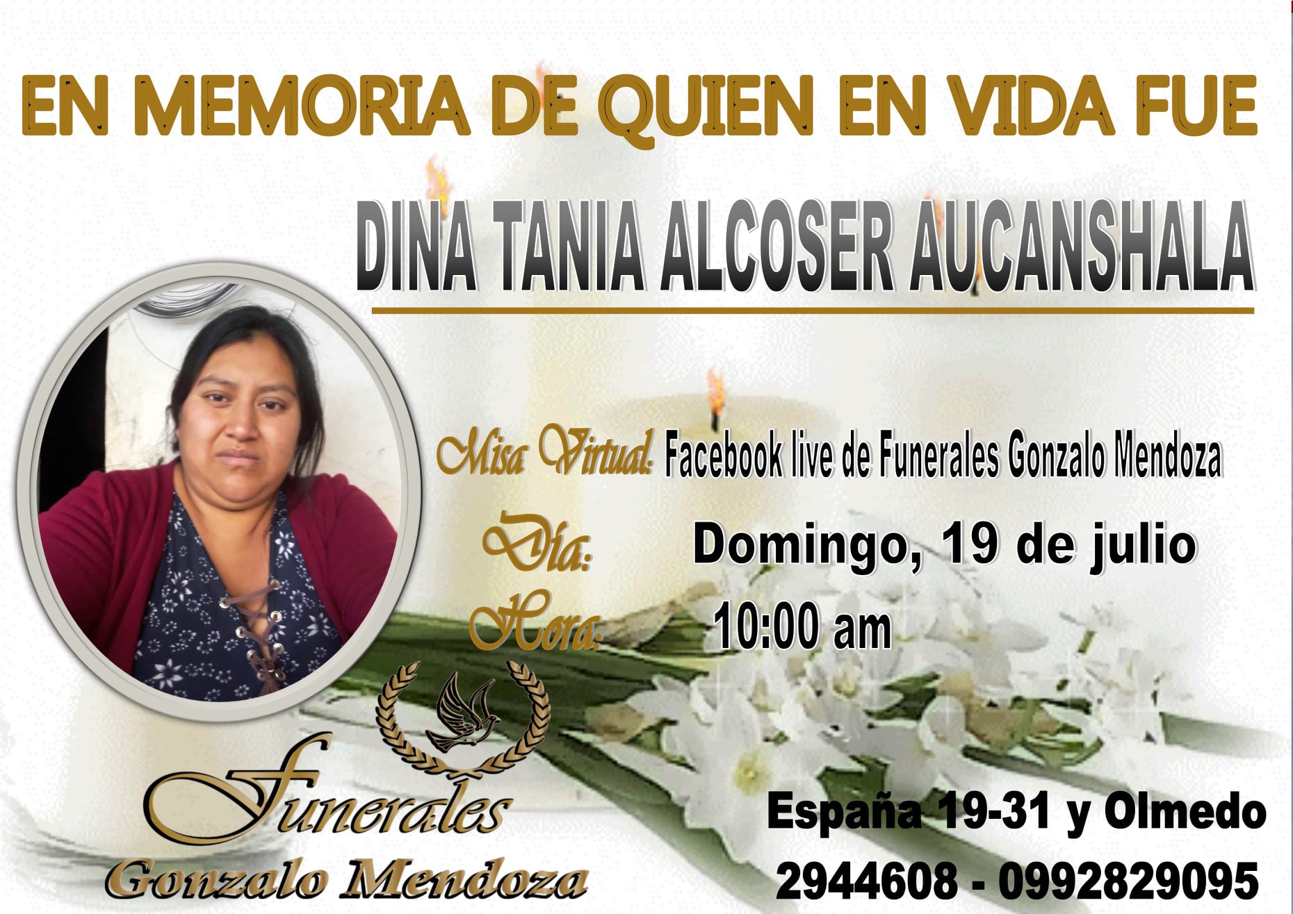 La misa virtual será transmitida por la página de Facebook live de Funerales Gonzalo Mendoza Cia. Ltda. el día Domingo 19 de julio a las 10 de la mañana.