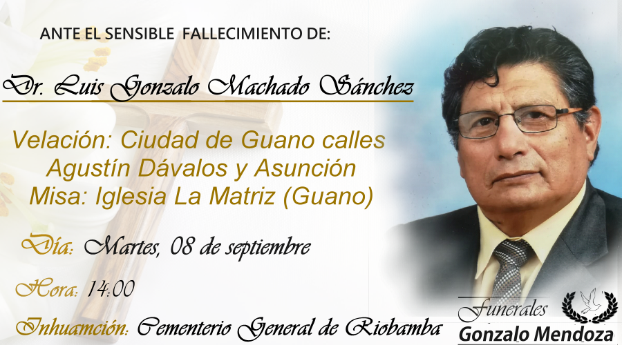 Sus restos mortales se están velando en la ciudad de Guano calles Agustín Dávalos y Asunción e invitan a su misa de cuerpo presente en la Iglesia La Matriz del Cantón Guano el día martes 08 de septiembre a las 2 de la tarde y de allí al Cementerio General de Riobamba.
