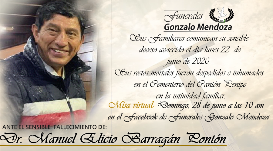 La misa virtual será transmitida por la página de Facebook live de Funerales Gonzalo Mendoza Cia. Ltda. el día Domingo 28 de junio a las 10 de la mañana.