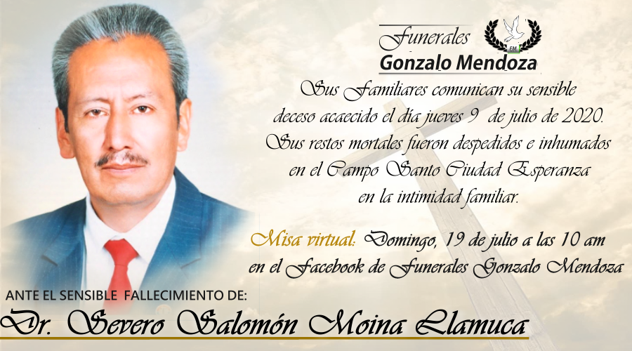 La misa virtual será transmitida por la página de Facebook live de Funerales Gonzalo Mendoza el día domingo 19 de julio a las 10 de la mañana