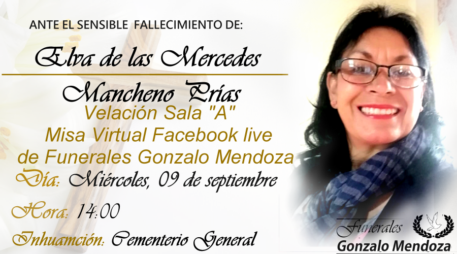 E invitan a la velación de sus restos mortales desde la Sala “A” de Funerales Gonzalo Mendoza”, donde se oficiará la misa virtual de cuerpo presente el día miércoles 09 de septiembre a las 2 de la tarde por Facebook live y de allí al Cementerio General para su cristiana sepultura.