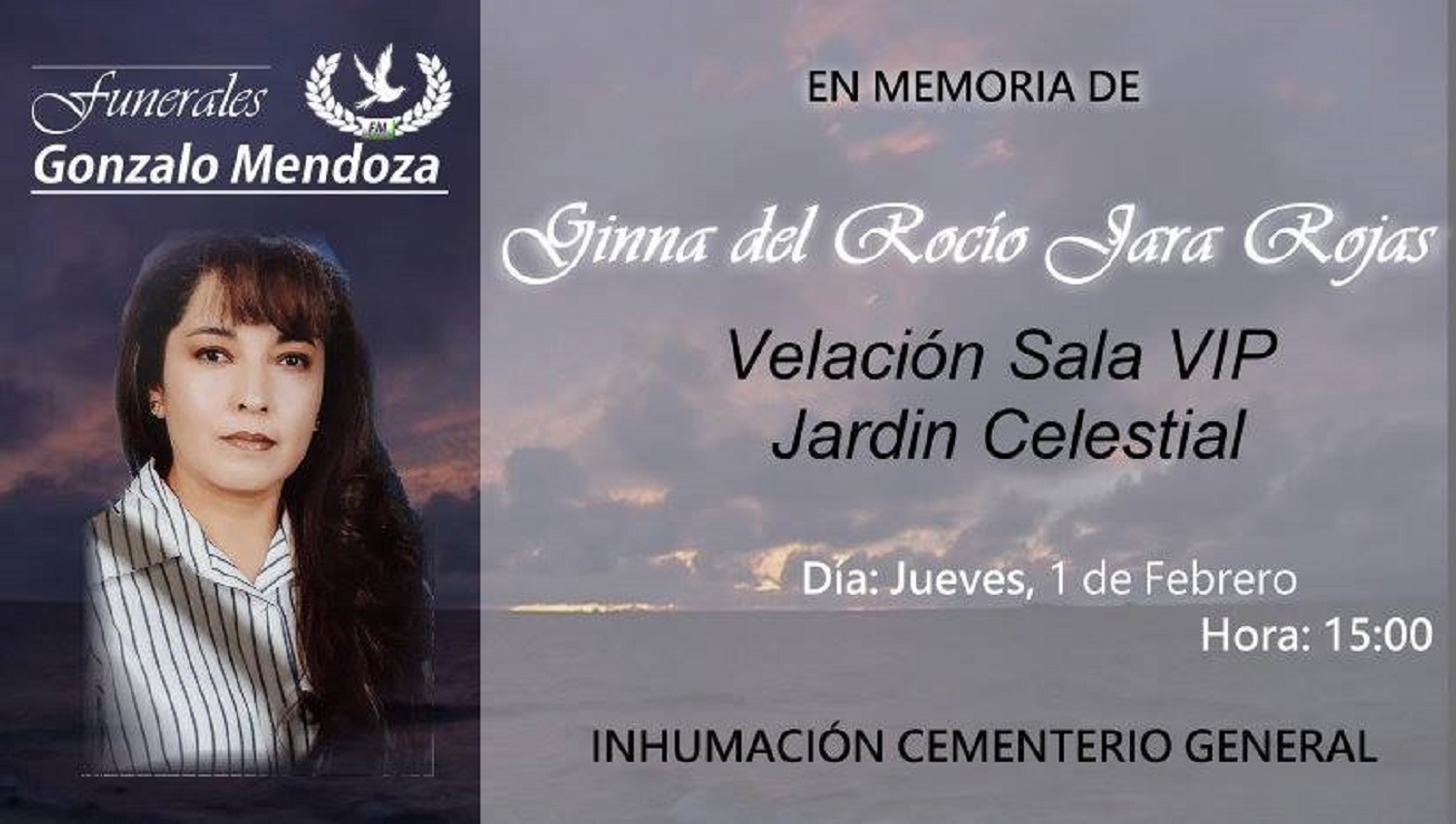 Tíos, primos y más familiares tienen el pesar de comunicar su sensible fallecimiento acaecido el miércoles 31 del presente e invitan a la velación de sus restos mortales en la sala “VIP Jardín Celestial” de Funerales Gonzalo Mendoza; donde se oficiará su misa de cuerpo presente el día jueves 1 de febrero a la 3 de la tarde y luego al Cementerio General para su cristiana sepultura.
