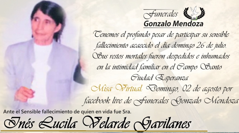 Su misa virtual será transmitida por la página de Facebook Live de funerales Gonzalo Mendoza, el día Domingo 02 de agosto del 2020 a las 10 de la mañana.