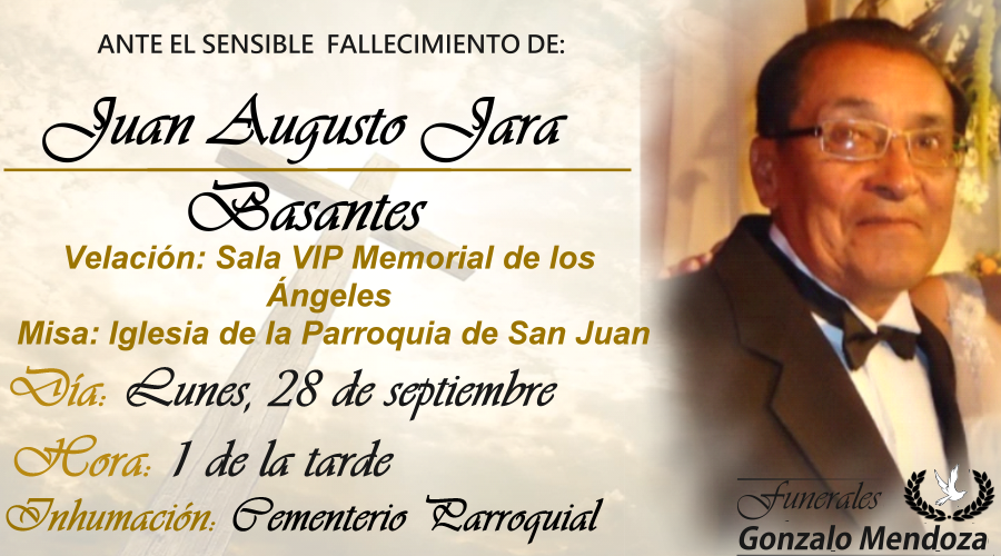 Y demás familiares tienen el pesar de comunicar su sensible fallecimiento acaecido el día domingo 27 de septiembre e invitan a la velación de sus restos mortales desde la Sala “VIP Memorial de los Ángeles” de Funerales Gonzalo Mendoza a la Iglesia de la Parroquia de San Juan el día lunes 28 de septiembre a la 1 de la tarde y de allí al Cementerio General del mismo lugar para su cristiana sepultura