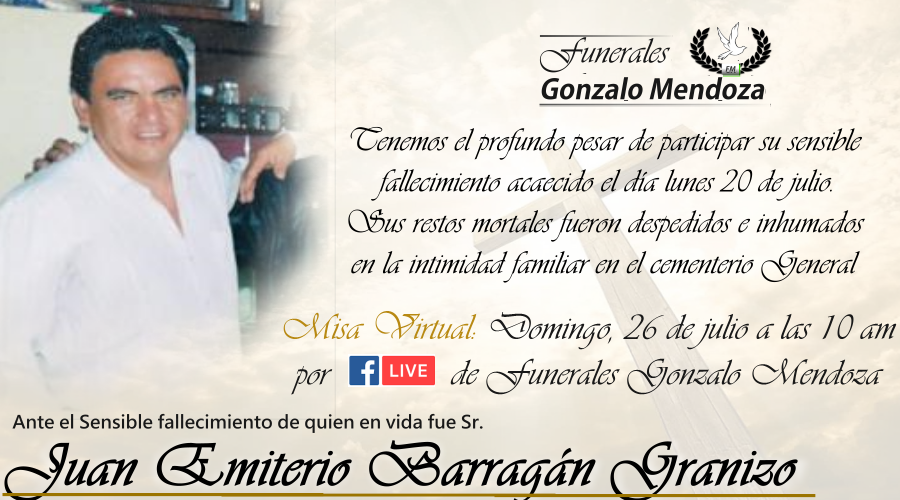 La misa virtual será transmitida por la página de Facebook live de Funerales Gonzalo Mendoza Cia. Ltda. el día Domingo 26 de julio a las 10 de la mañana.
