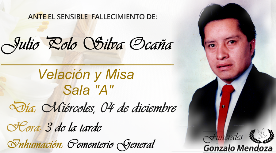 E invitan a la velación de sus restos mortales en la “A” de Funerales Gonzalo Mendoza donde se oficiará sus honras fúnebres el día miércoles 04 de diciembre a las 3 de la tarde y de allí al Cementerio General para su cristiana sepultura.