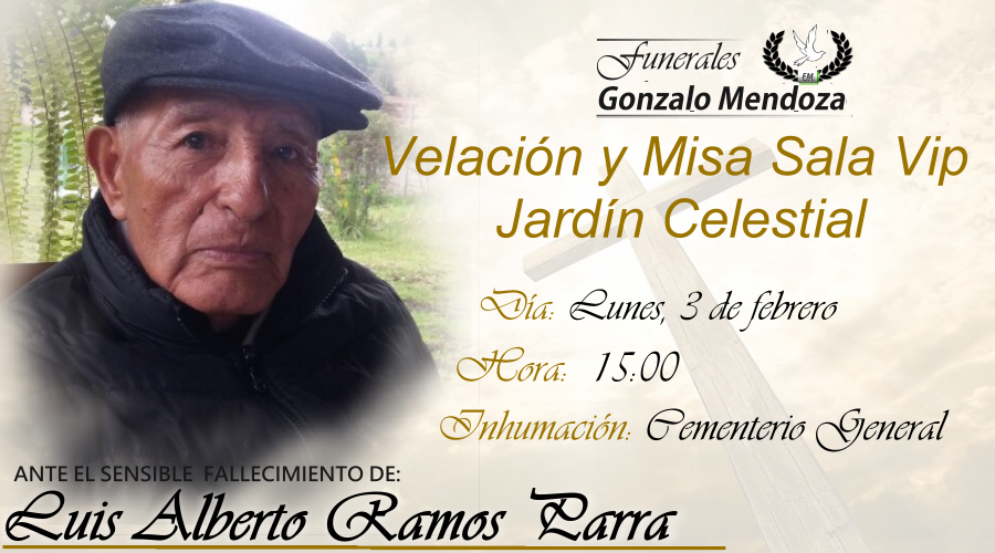 Bisnietos, primos y demás familiares tienen el pesar de comunicar su sensible fallecimiento acaecido el domingo 02 del presente mes e invitan a la velación de sus restos mortales desde la Sala VIP Jardín Celestial de Funerales Gonzalo Mendoza, donde se oficiará sus honras fúnebres el día lunes 03 de febrero a las 3 de la tarde y de allí al cementerio General para su cristina sepultura.
