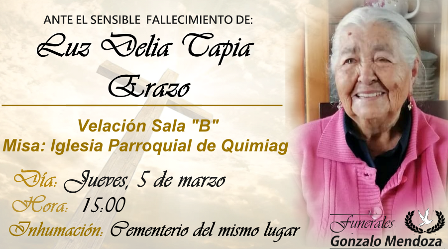 E invitan a la velación de sus restos mortales en la Sala “B” de Funerales Gonzalo Mendoza, la misa de cuerpo presente se oficiará en la Iglesia Parroquial de Quimiag el día Jueves 5 de Marzo a las 15h00 y de allí al Cementerio General del mismo lugar para su inhumación.