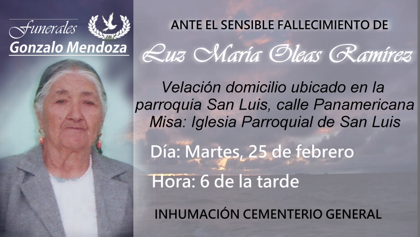 E invitan a la velación de sus restos mortales en su domicilio ubicado en la parroquia San Luis, calle Panamericana, sus honras fúnebres se realizarán en la Iglesia Parroquial de San Luis el día martes 25 de febrero a las 18h00 y luego al cementerio del mismo lugar para su cristiana sepultura.