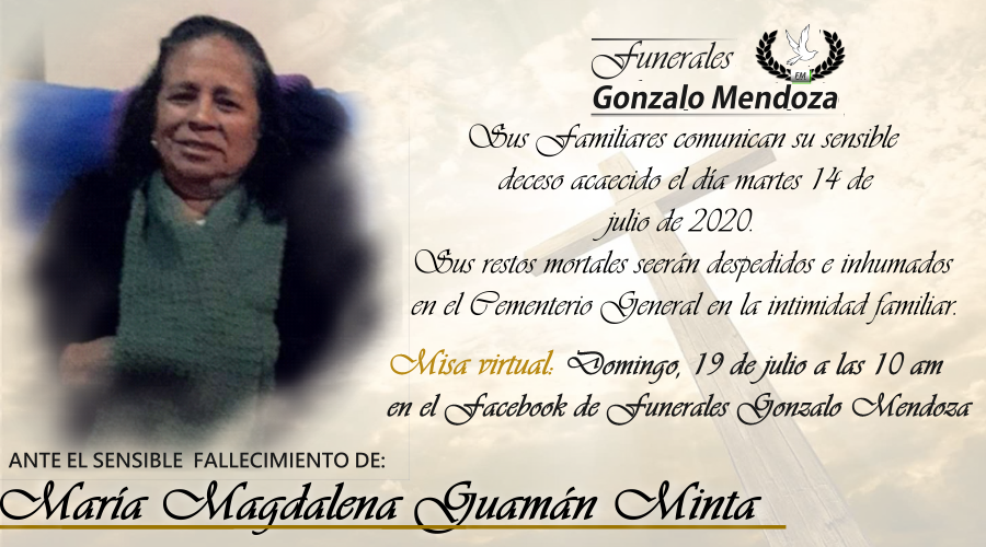 E invitan a la misa virtual será transmitida por la página de Facebook live de Funerales Gonzalo Mendoza el día domingo 19 de julio a las 10 de la mañana