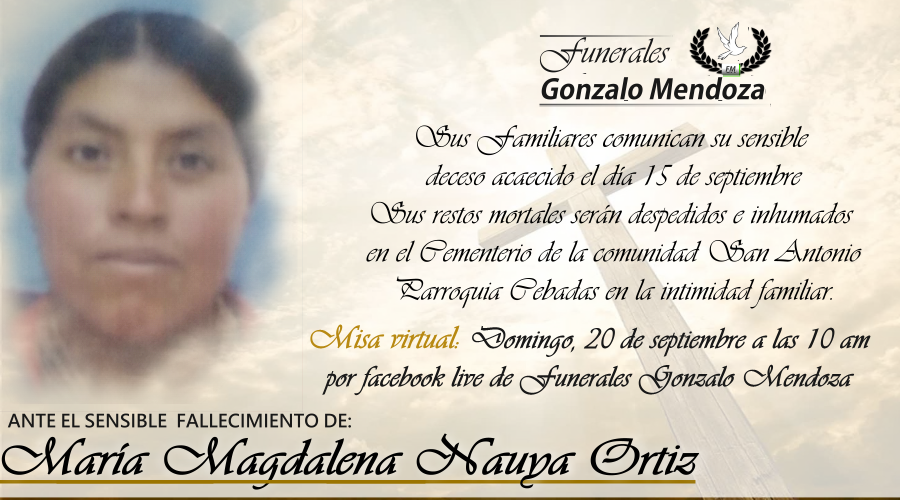 Y de más familiares tienen el pesar de comunicar su sensible fallecimiento acaecido el día 15 de septiembre sus restos mortales serán despedidos e inhumados en Cementerio General de la comunidad San Antonio Parroquia Cebadas en la intimidad familiar
