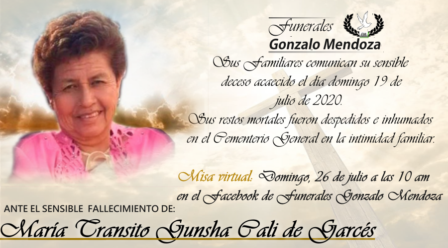 La misa virtual será transmitida por la página de Facebook live de Funerales Gonzalo Mendoza el día domingo 26 de julio a las 10 de la mañana
