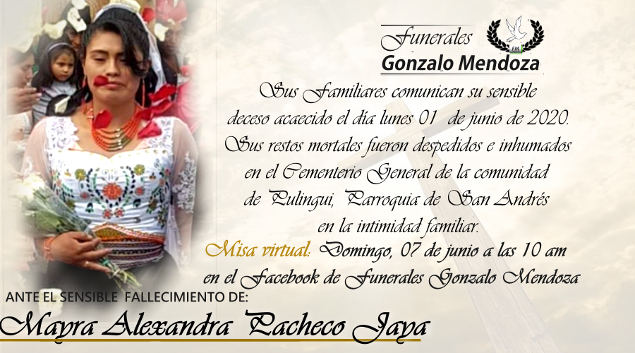 TÍOS, SOBRINOS, PRIMOS Y MÁS FAMILIARES TIENEN EL PESAR DE COMUNICAR EL SENSIBLE FALLECIMIENTO ACAECIDO EL DÍA MARTES 02 DE JUNIO DEL 2020 Y SUS RESTOS MORTALES SERÁN TRASLADADOS AL CEMENTERIO COMUNAL DE PULINGUI PARA SU CRISTIANA SEPULTURA EN LA INTIMIDAD FAMILIAR.
