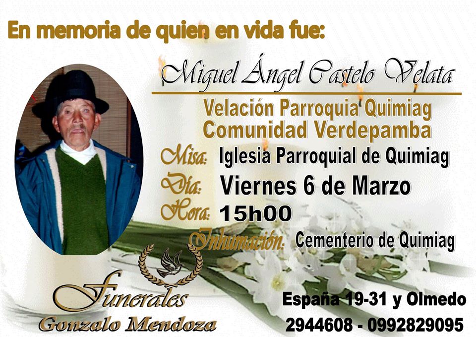 E invitan a la velación de sus restos mortales desde la Parroquia Quimiag, Comunidad Verdepamba, la misa de cuerpo presente se oficiará en la iglesia parroquial el día Viernes 06 de Marzo a las 15h00 y de allí al Cementerio General de Quimiag para su cristiana sepultura.