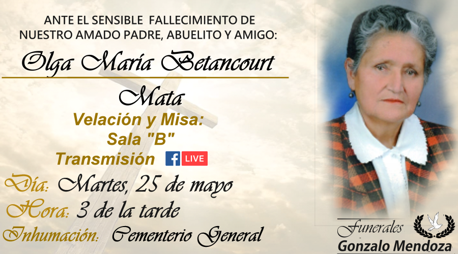 Sobrinos, primos y demás familiares tienen el pesar de comunicar el sensible fallecimiento acaecido el día lunes 24 de Mayo e invitan a la velación de sus restos mortales en la Sala B de Funerales Gonzalo Mendoza, donde se oficiará la misa de cuerpo presente el día martes 25 de mayo a las 15h00 y posteriormente al Cementerio General para la inhumación.