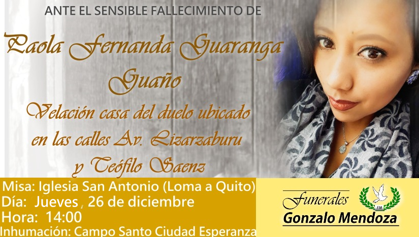 E invitan a la velación de sus restos mortales desde la casa del duelo ubicado en las calles Av. Lizarzaburu y Teófilo Saenz, a la iglesia San Antonio (Loma a Quito) donde se oficiará sus honras fúnebres el día jueves 26 de diciembre a las 14h00 y de allí al Campo Santo ciudad Esperanza para su cristiana sepultura.