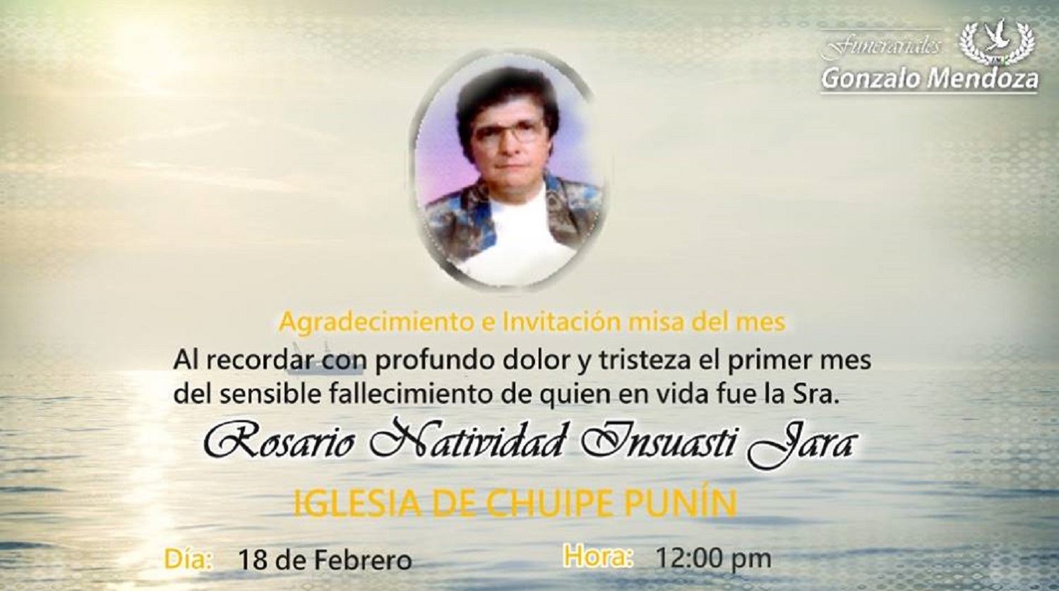 E invitan a la misa que por el eterno descanso de su alma se celebrará en la iglesia de Chuipe Punín, el día domingo 18 de Febrero a las 12H:00.