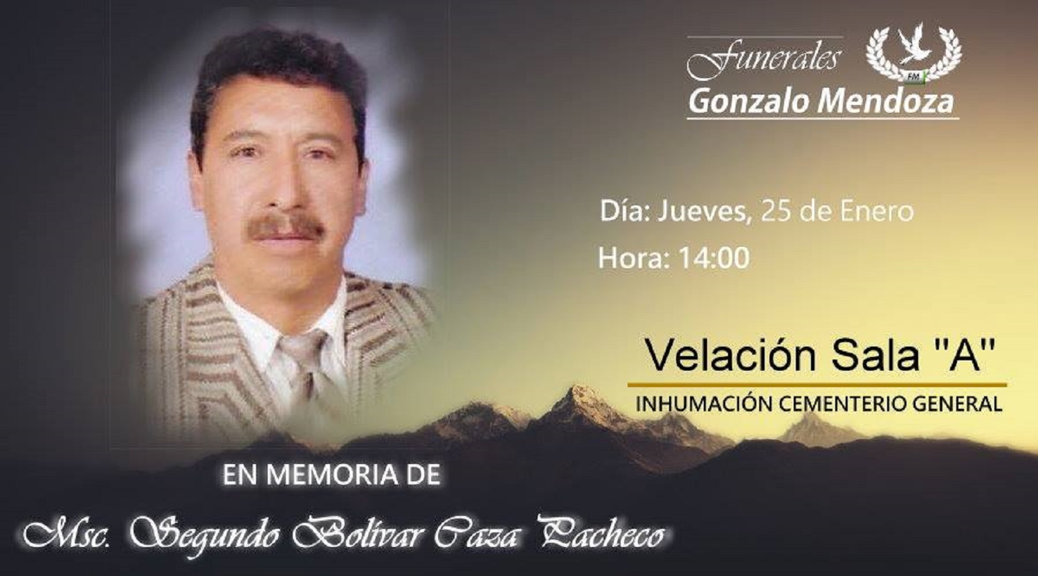 Y más familiares tienen el pesar de comunicar su sensible fallecimiento acaecido el día miércoles 24 del presente e invitan a la velación de sus restos mortales En la sala “A” de Funerales Gonzalo Mendoza; donde se oficiará sus honras fúnebres el día jueves 25 de Enero a las 2 de la tarde, luego al Cementerio General para su cristiana sepultura.