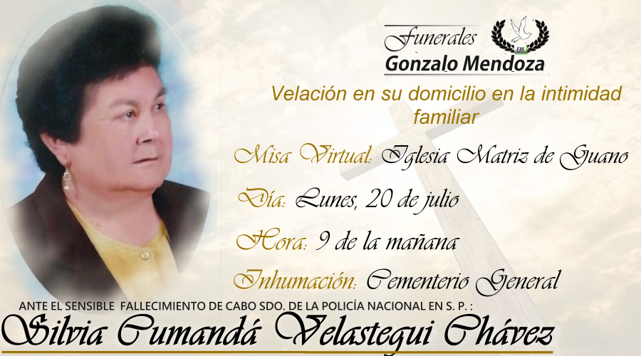 Primos y demás familiares tienen el pesar de comunicar su sensible fallecimiento acaecido el día domingo 19 de julio de 2020, su velación se dará en la intimidad familiar y la misa de cuerpo presente será en la iglesia Matriz del Cantón Guano el día lunes 20 del presente a las 9:00, la misma que será transmitida vía virtual y de allí al Cementerio General para su cristiana sepultura