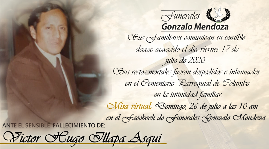 La misa virtual será transmitida por la página de Facebook lice de Funerales Gonzalo Mendoza el día domingo 26 de julio a las 10 de la mañana
